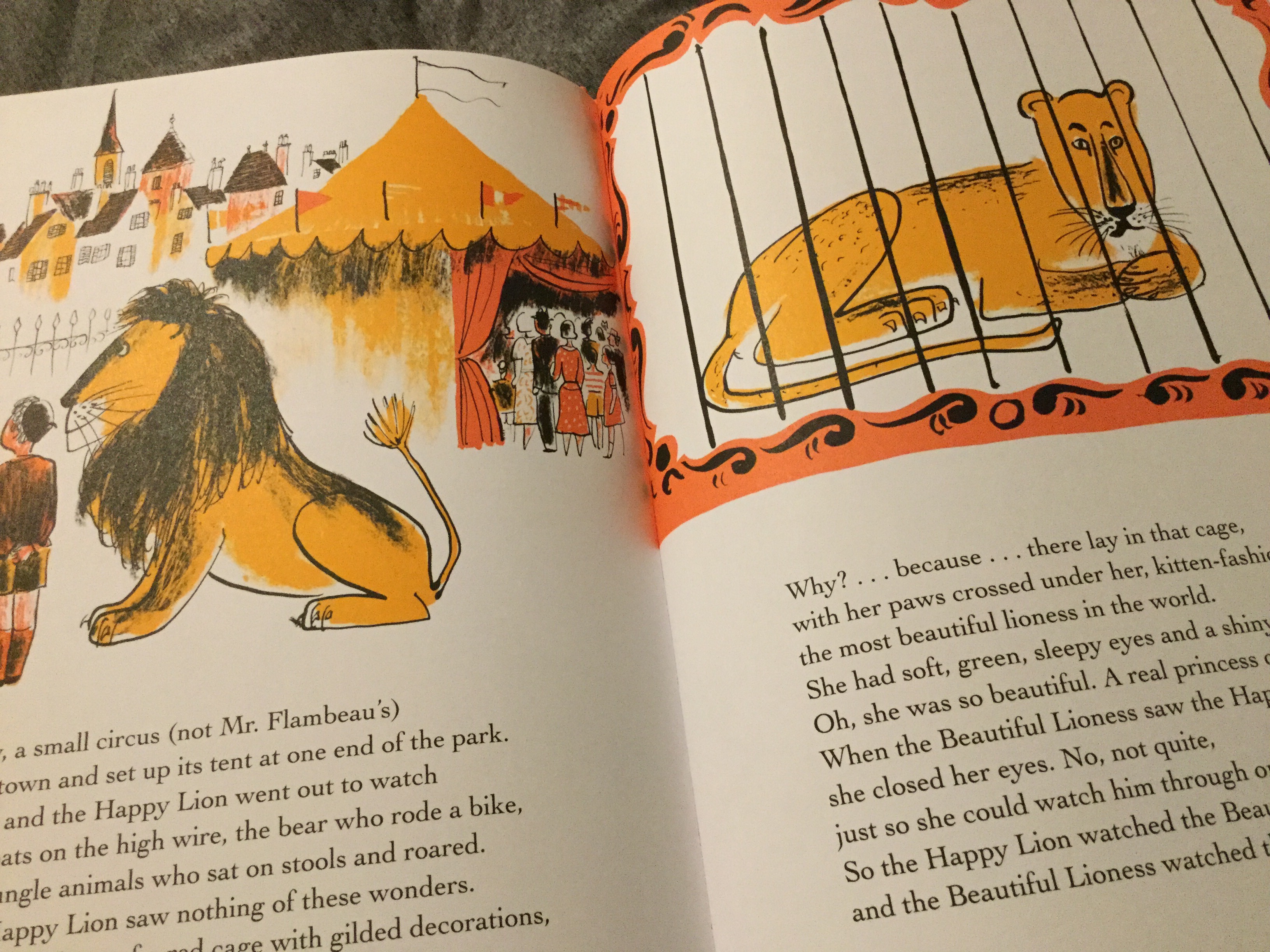 A joyous story which sees the return of our favourite Happy Lion, though he is not a very happy or content lion at all, until he meets the most beautiful princess of lionesses. A perfect cat and a perfect match for the Happy Lion if only she didn’t belong to the circus. We know and love the Happy Lion and his intelligence and cleverness is no match for the circus. A hunt for the missing lioness is coming to an end until a small girl sees that the Happy Lion has two tails. Will anyone attempt to separate the two love birds? Unlikely! The unhappy lion is happy again! The wonderful illustrations from Roger Duvoisin are to be celebrated and enjoyed, as is the lovely story!