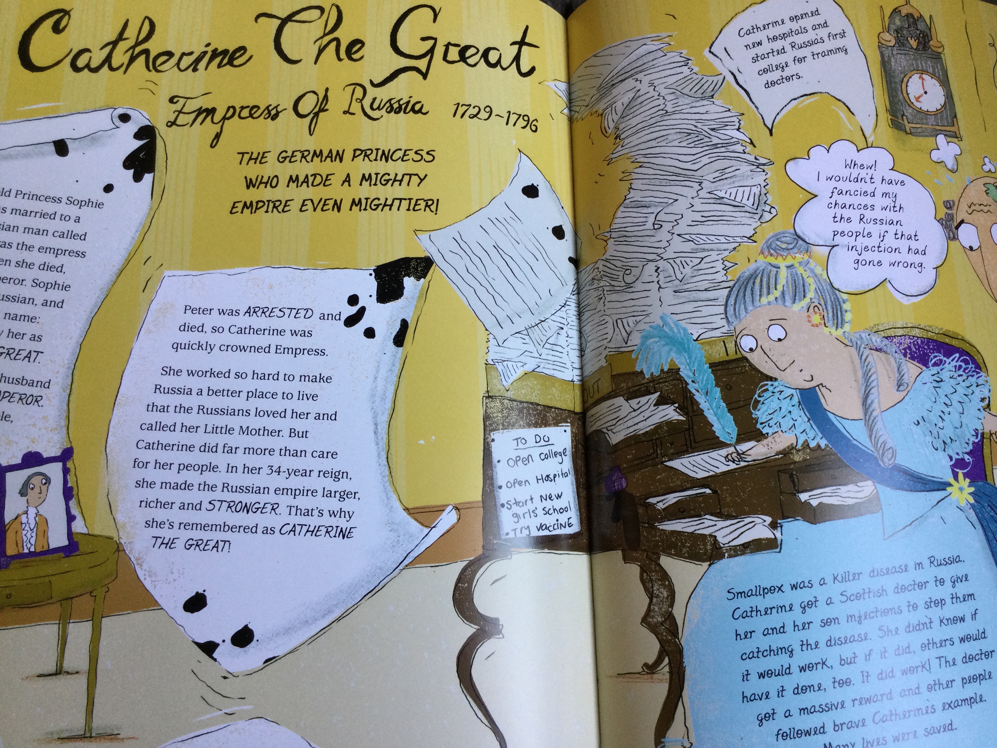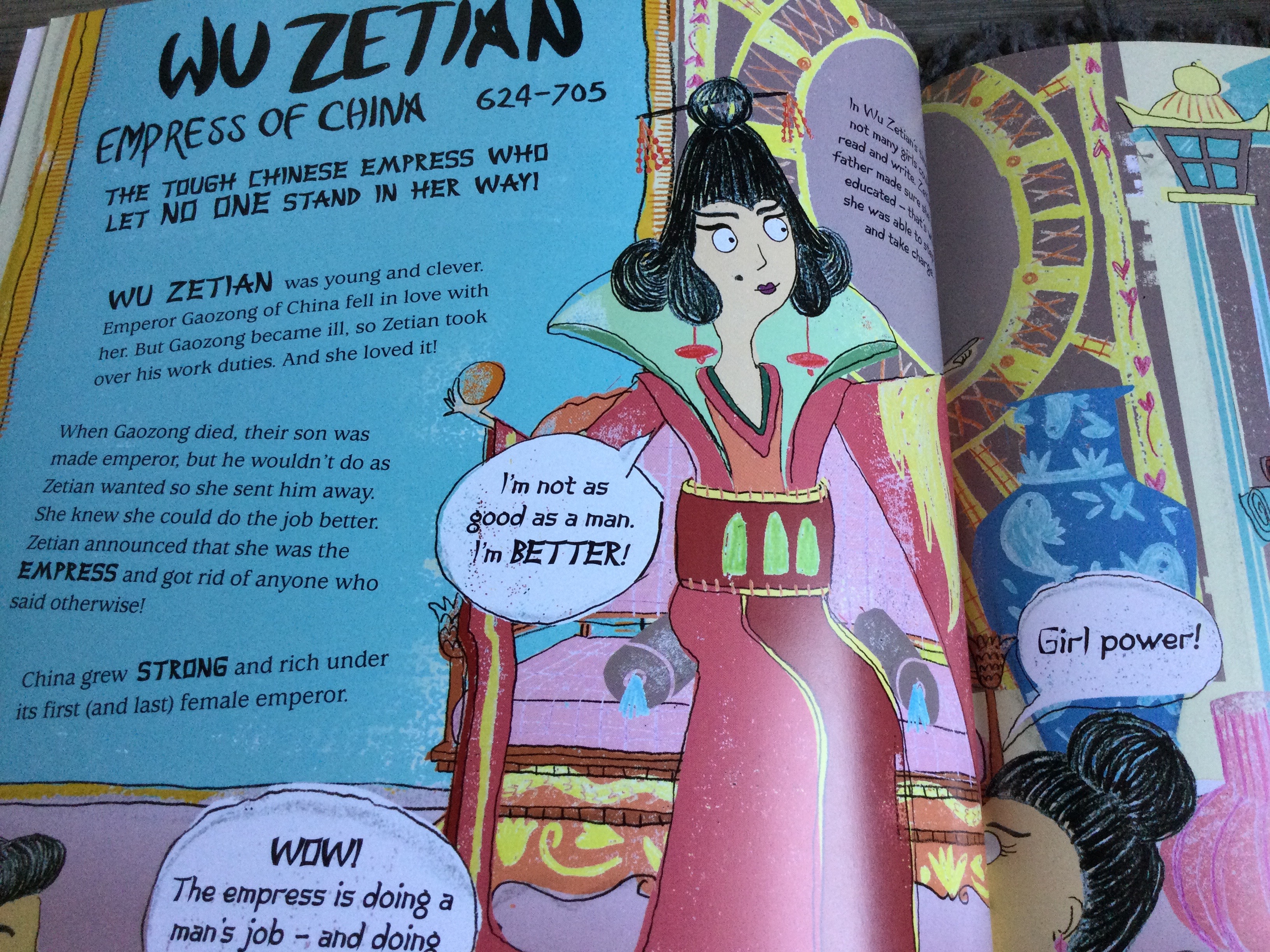 I have been anxiously awaiting this book to read and learn about the fabulously feisty queens from history. From all eras in history, there are plenty of amazing women who ruled their countries or empires. Most of the queens have a stunning double page spread uniquely designed and illustrated to suit the era, style of reign and fashion. The pictures tell us as much about the queens as the quick facts and text on each page. A great balance of well known figures from history, including Cleopatra and Boudica, to the lesser known Razia from Delhi and Yaa Asantewaa from Africa. A superb book highlighting and celebrating strong women from history!