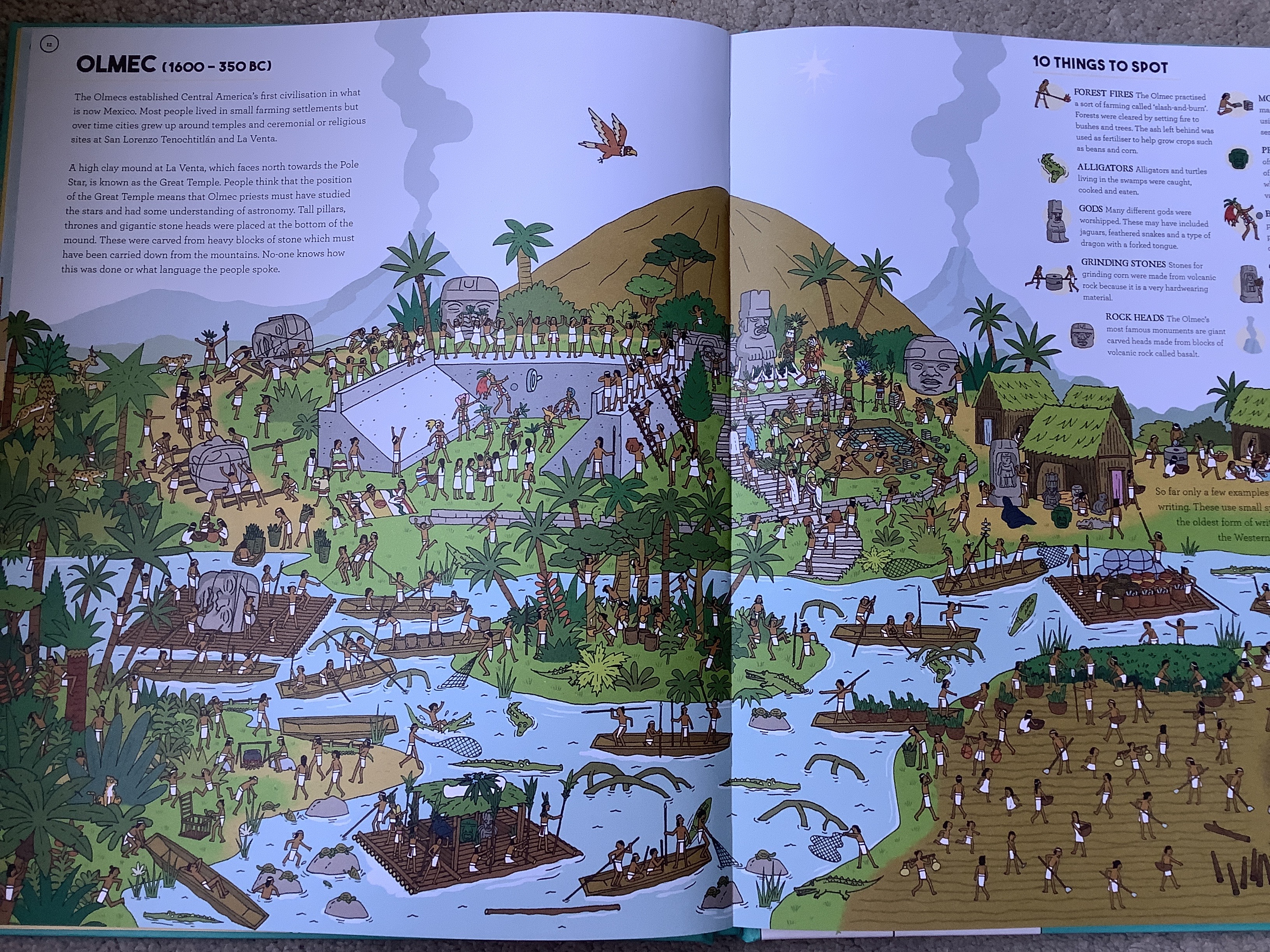 I love scanning the pages for details and when this book arrived with a magnifying glass, I was impressed and excited. It meant that my kids and I could find those items hidden on each page. With an almost Where’s Wally vibe, this book will keep readers entertained for hours! Using the magnifying glass allows you the chance to delve further into those ancient history details. Spanning thousands of years, this reveals some interesting views on ancient societies and peoples. There are some empires that I was unfamiliar with and was keen to know more about, most particularly, the Kingdom of Kush (800BC- 350AD) and the Xiongnu Empire (209BC-46AD). Fascinating insights and items to spot!
