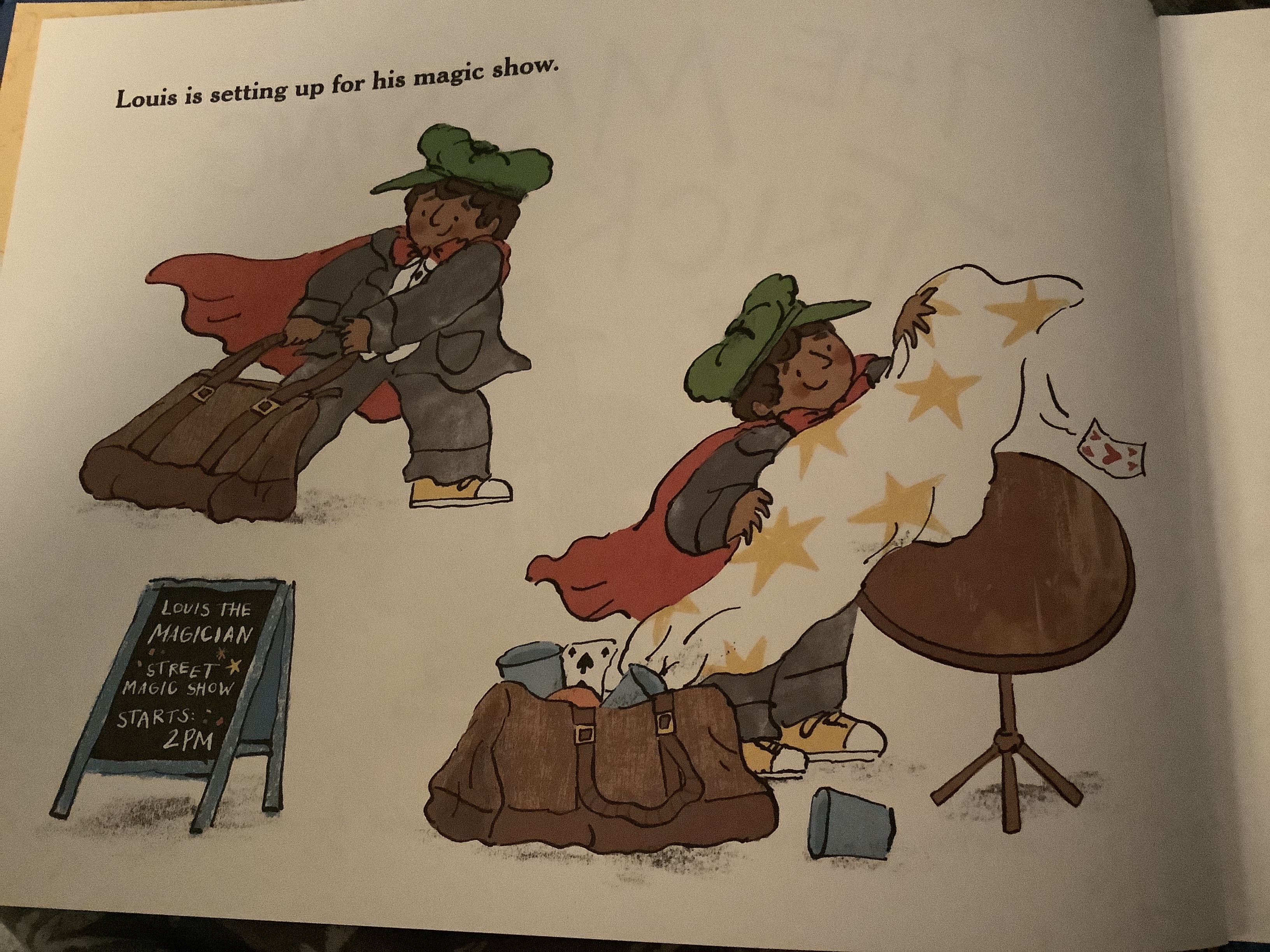 An entirely clever and brilliantly illustrated story, where fewer words and more reliance on images will allow readers to tell their own version of events. Louis is setting up got his magic show and we can view everything that he does and that happens, and each turn of the page adds a new element to the story, from new audience members, accidents with his props and the domino effect of each added element providing its own show before Louis can actually begin properly. Louis is searching for his Rabbit, an integral part of his show but he is nowhere to be found. Simple questions on each page provide ample entertainment for the audience in the book and those holding the book! I can’t recommend this one highly enough for reading aloud and allowing children to explain what is happening in the story, perhaps finding those small details missed by others and sharing in the joy of a magic show!