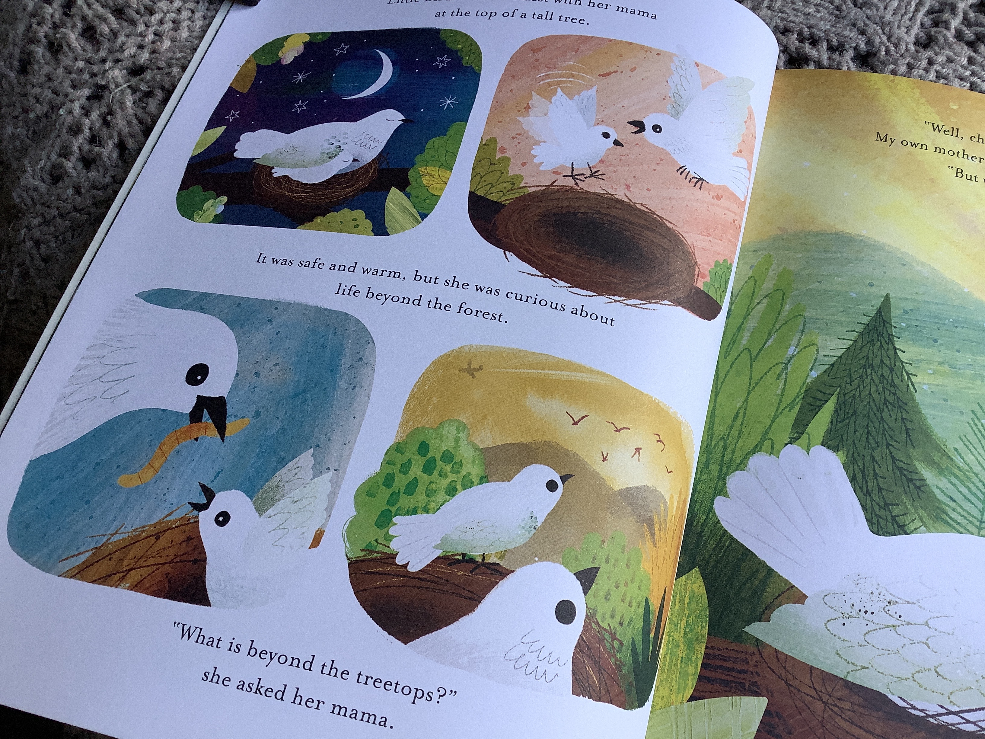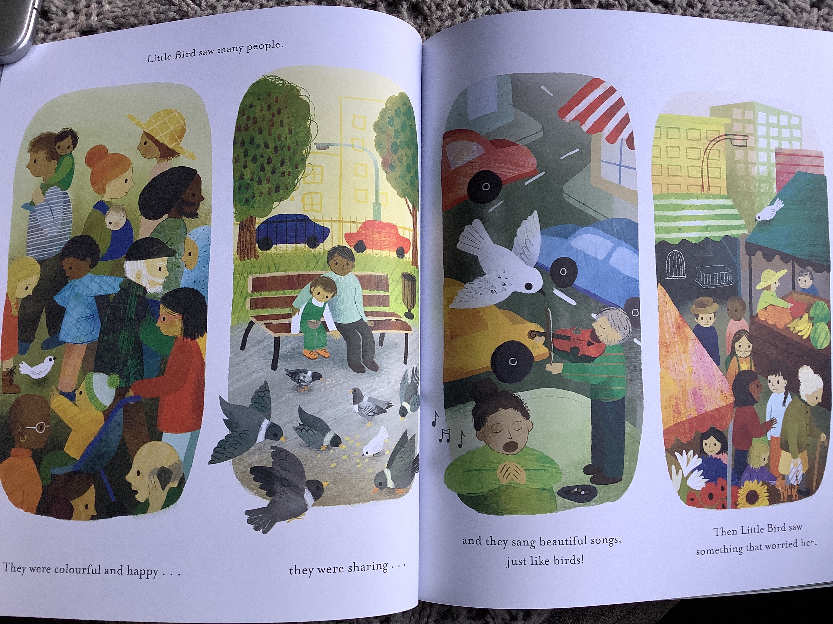 A gorgeously illustrated book of contradictions and comparisons between humans and birds. Little bird is keen to satisfy her curiosity of people and the world beyond her trees and nest. Soaring above the land, she learns one thing and then another until she is confused by what she sees of people and their actions. From quiet towns to destroyed cities, loud, quiet, dangerous and kind people, Little Bird has much to share with her Mama, if she can ever make it home. The birds eye views in the pages of this book allow the reader to change their own perspectives on people and the world. What the little bird will remember most is the kindness she witnessed- something we all want to remember and share! What a beautiful book to share in a whole school assembly.