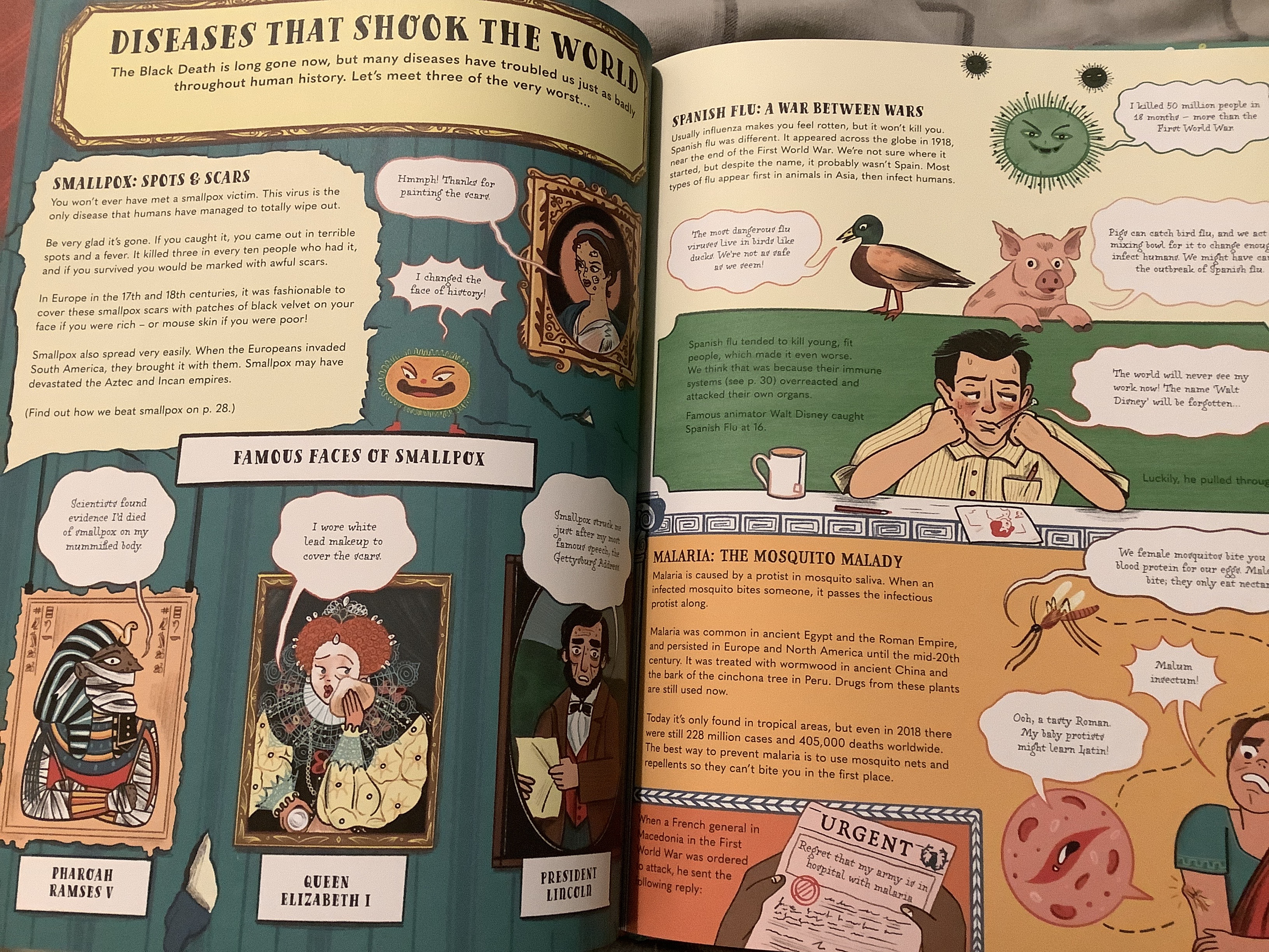 A timely book in our COVID challenging times…one that may just help explain the internal wars that humans have been fighting against microbes for centuries. Told with humour and illustrated with style, this book brings microbes to life and shares some of the history and science behind them. With a graphic novel feel, and use of infographics this book is a delight to study. The text and topic are more suited for a KS2 classroom but KS1 children will enjoy browsing the pages and imagining fighting the microbes in their body. History proves that we can learn from previous battles and move forward with hope for defeating other microbes in the future. I learned so much from this book, it is one I will re-visit time and time again, likely taking something new from each visit.