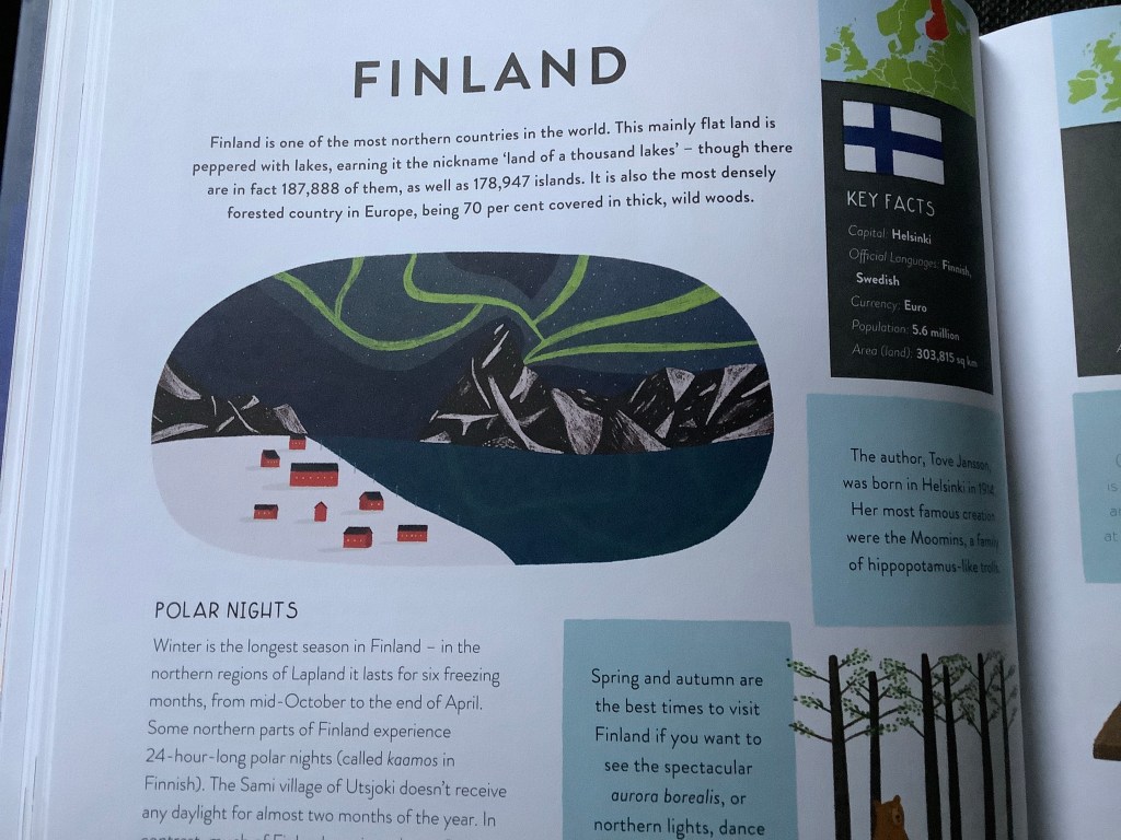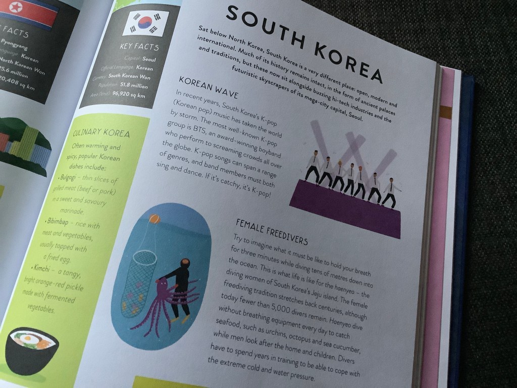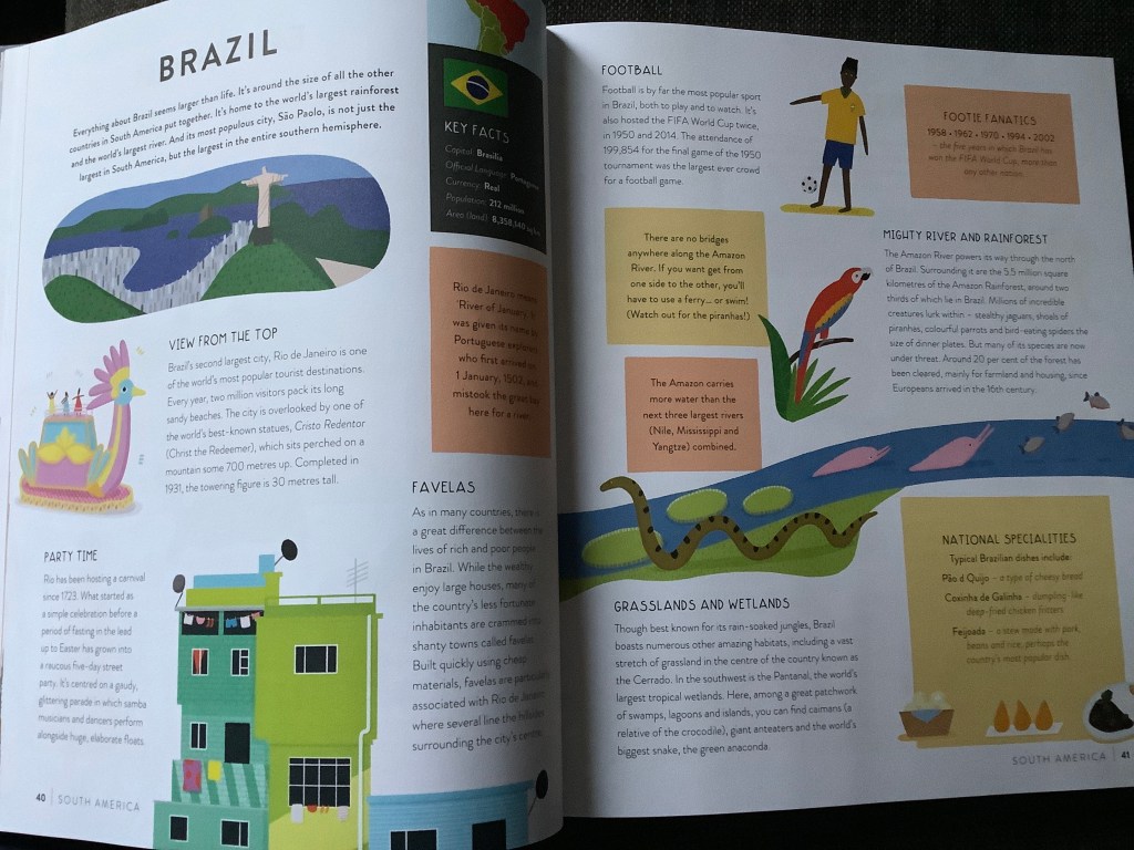 This large hard backed book landed one afternoon and I was very keen to browse, read and learn about the world. With every country represented through facts and illustrations, there is so much to enjoy in this book. Geography is not my strength and I found myself lost in the pages, travelling across continents and oceans to discover new and wonderful places.