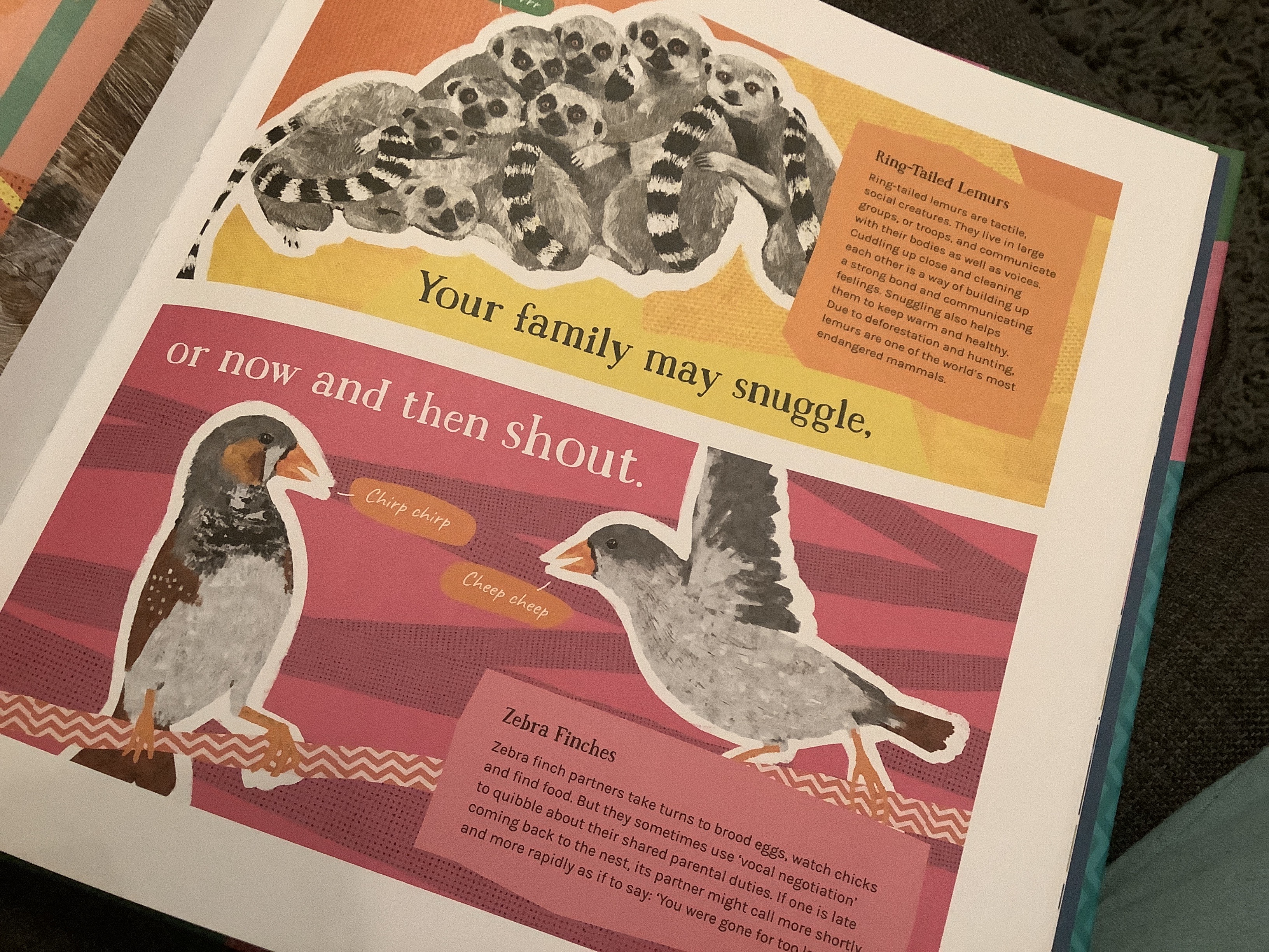 This book takes a unique look at families, both human and animal. I found that I was reading this book in two ways, one just as a story with a message on how unique and special every family is, and second as an information book. I would take each animal and read the short blurb about their family groupings. Utterly fascinating, this is an amazing book suitable for all ages. The cleverly designed pages are creative, engaging and colourful. While you are reading and learning about animals, there is a reflection on human family groupings and choices. A great way to build empathy and understanding for the different families in one class, this is a book I would share widely across the school.