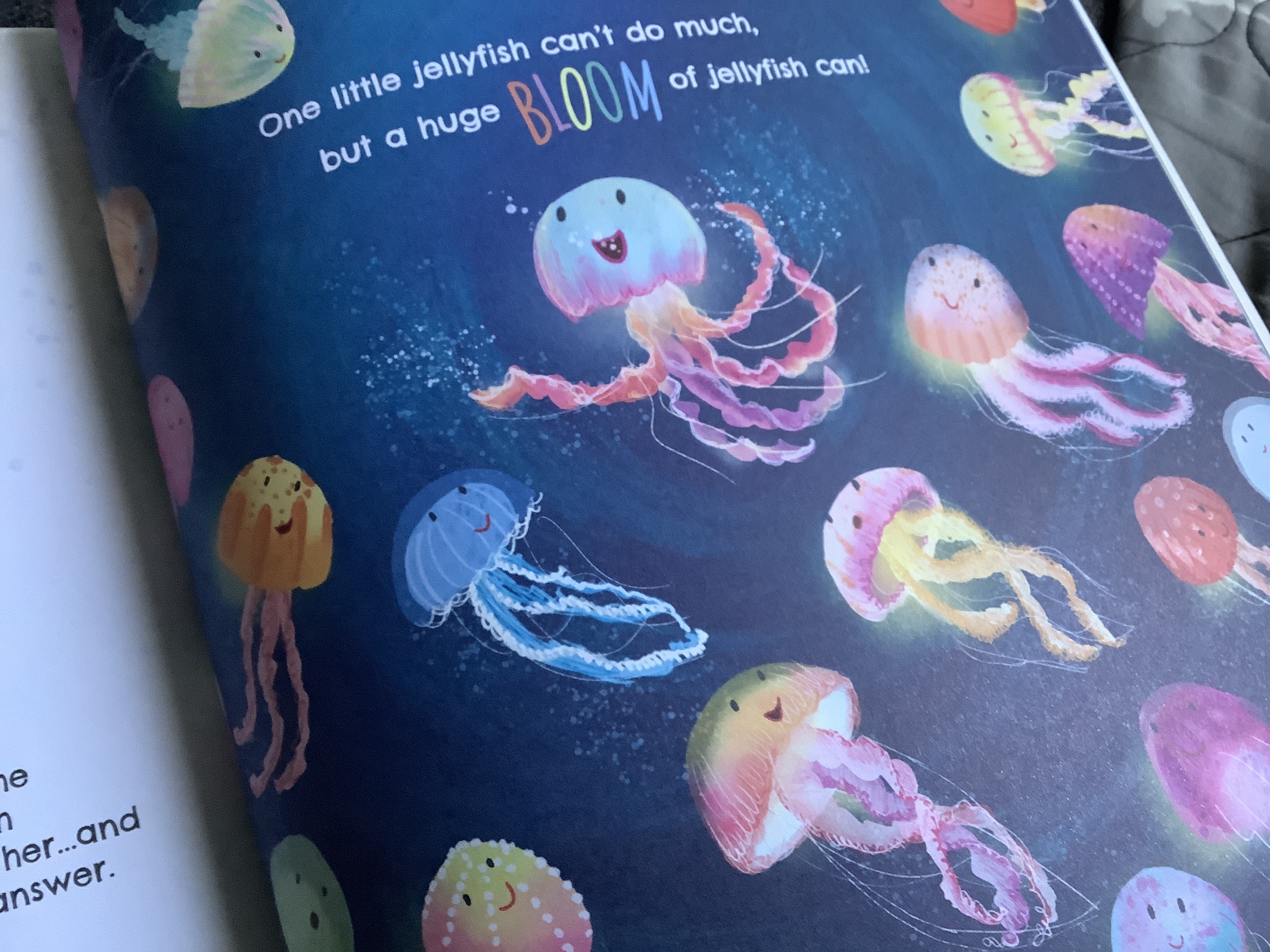 The cover of this book is intensely colourful and engaging, which I am thrilled to say continues into the pages of the book. Jellyfish travels around the oceans but always returns home to her friends, sharing her stories and sights. Her friends begin noticing differences in their ocean, warmer waters, new shells and different looking fish. When Jellyfish returns home the next time, everyone is gone and she must find them. She enlists the help of a “bloom” of jellyfish, who also help her to deliver a vitally important message to the humans who are polluting the oceans.