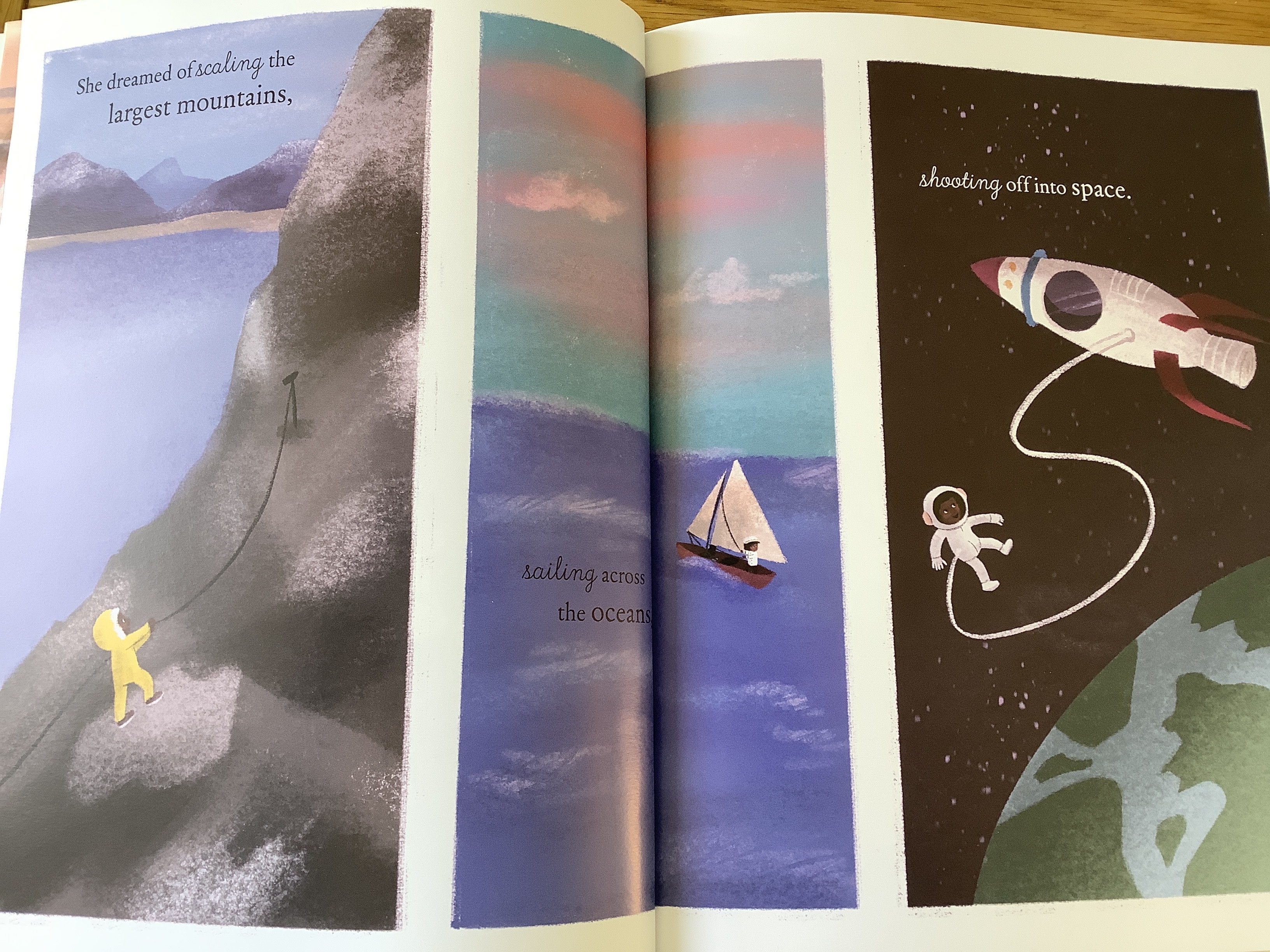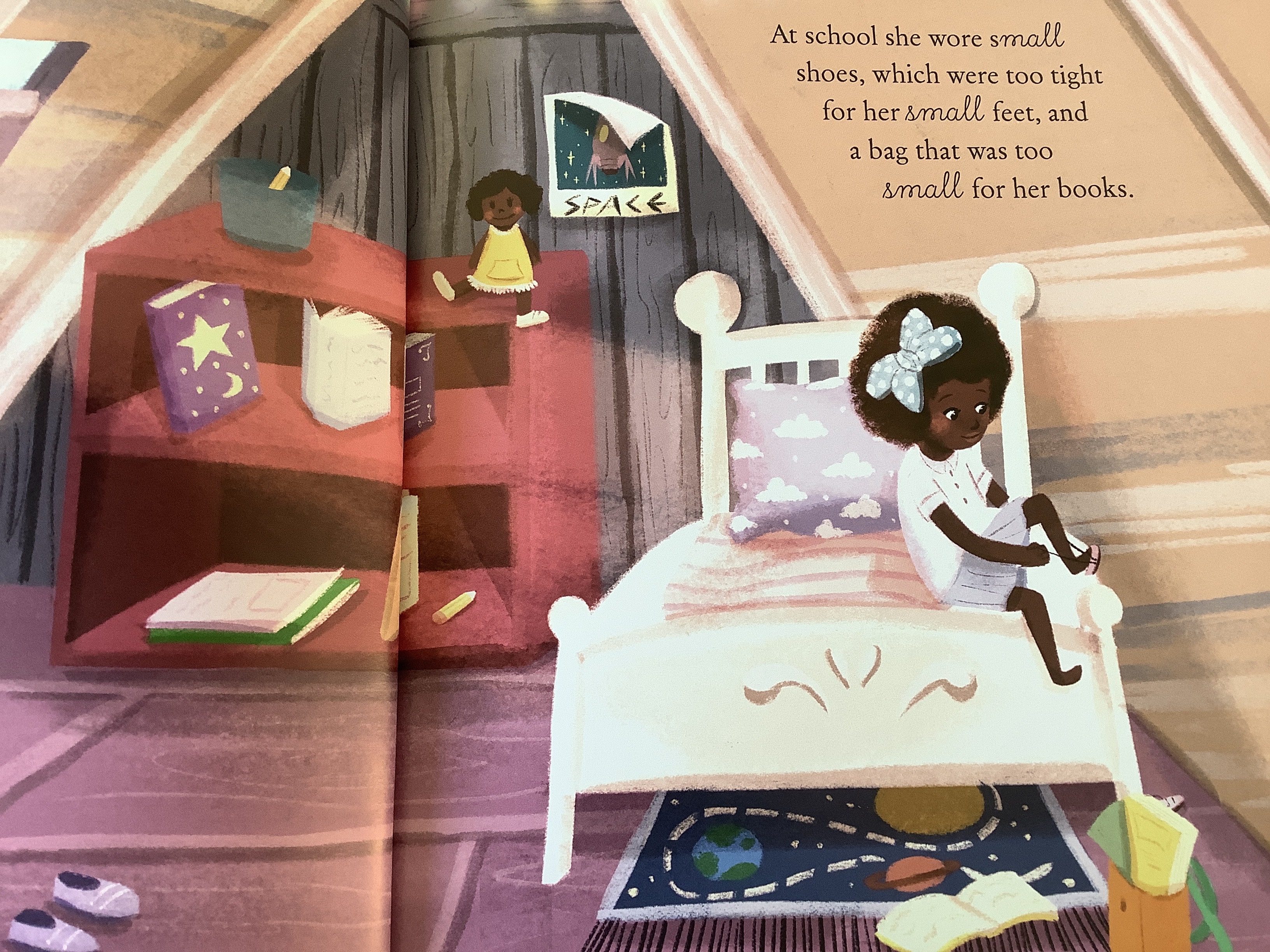 A gorgeous book that aims to encourage children to dream big! Small lives a small life in a small house with small shoes, blankets and bags but at night when she dreams, her dreams are huge! She can climb mountains, sail the seas or orbit in space- there is nothing holding her back. Everyday, she hears “Head down and feet on the ground” which is sad as she should be encouraged to use her imagination and to dream big! An empowering story that proves you are entitled to dream big and should aim for the stars, even when faced with adversity! Beautifully illustrated, Small comes to life and shares her dreams with readers in the hopes they too will dream big!