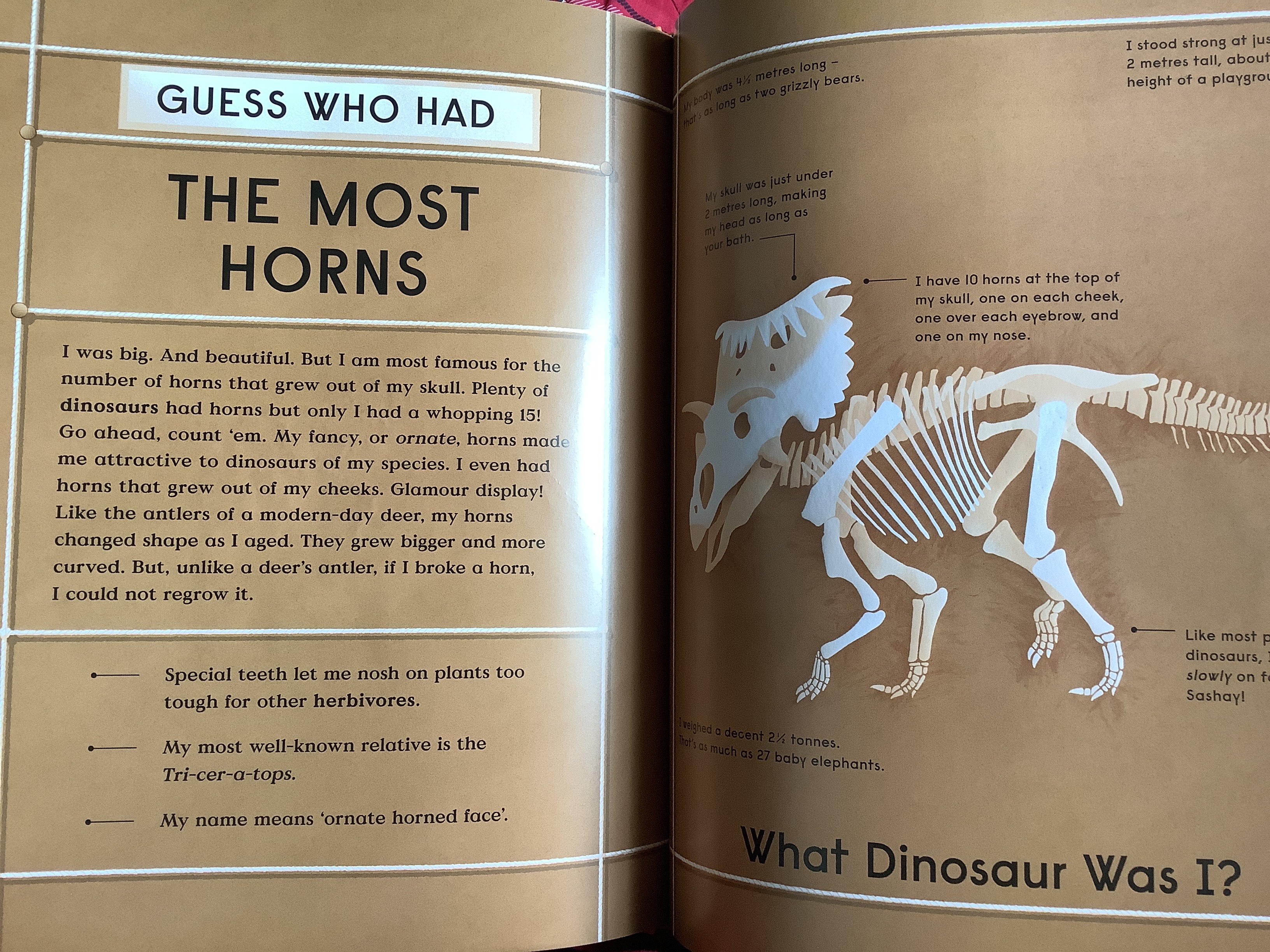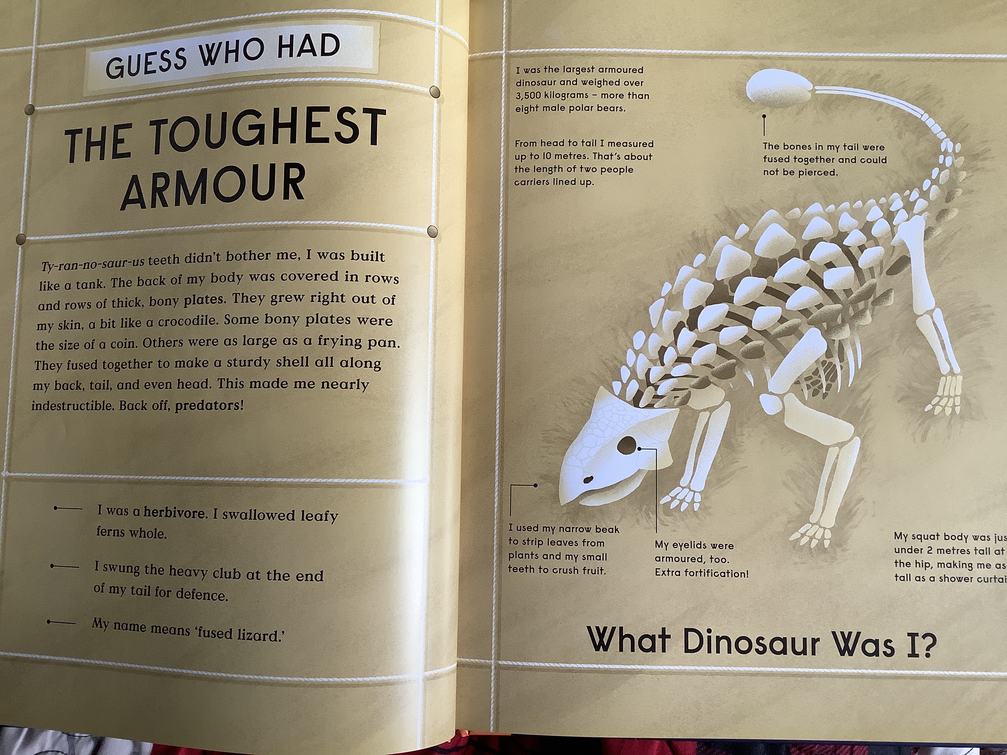 This informative book acts as a guess who game for readers. There are 10 record breaking dinosaurs featured in the book and readers are given clues and facts to read before discovering whether they guessed the correct dinosaur. While some are very well known and familiar, there were a few new creatures for me to learn about. Young dinosaur experts and would be palaeontologists will discover some brilliant information about pre-historic creatures and the glossary will help them sound like an expert. This large volume is different to other dinosaur books and I know young readers will appreciate the style, game and fun this book offers. The illustrations are brilliant, from the skeletons to the creatures and their habitats, all done with care and detail.