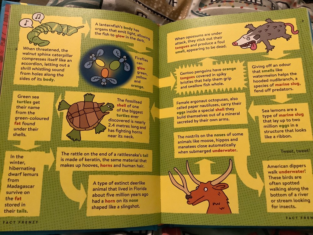 It’s like an exciting vortex of facts and you never know just what weird and wonderful things you might learn. A particular favourite in this book was the “Fact Frenzy” which was a double page spread filled with extra facts. I can imagine a class of readers going on a “fact frenzy” with this entire series with prizes for weirdest fact found!
